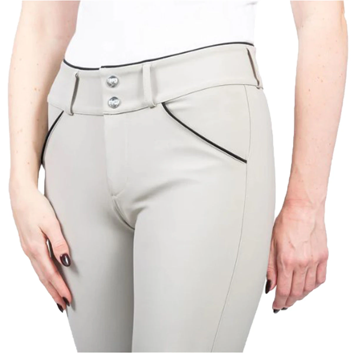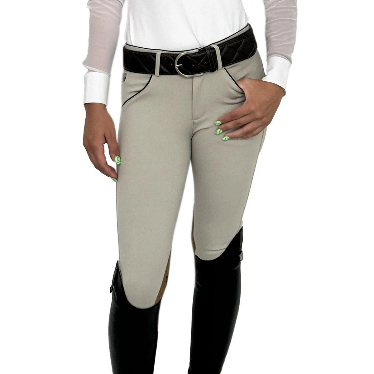 The timeless beige color is accented by sleek black piping on the pockets and waistline, adding a touch of sophistication. With reinforced knee patches and a silicone grip, these breeches allow you to ride with style and comfort. Upgrade your riding experience with these exceptional breeches!