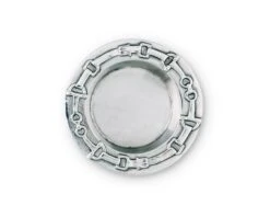 Leathery straps connect bits through interlocking squares to create a textured border around the edge of this piece. The symmetrical design accentuates the otherwise smooth finish of this handmade, aluminum coaster.