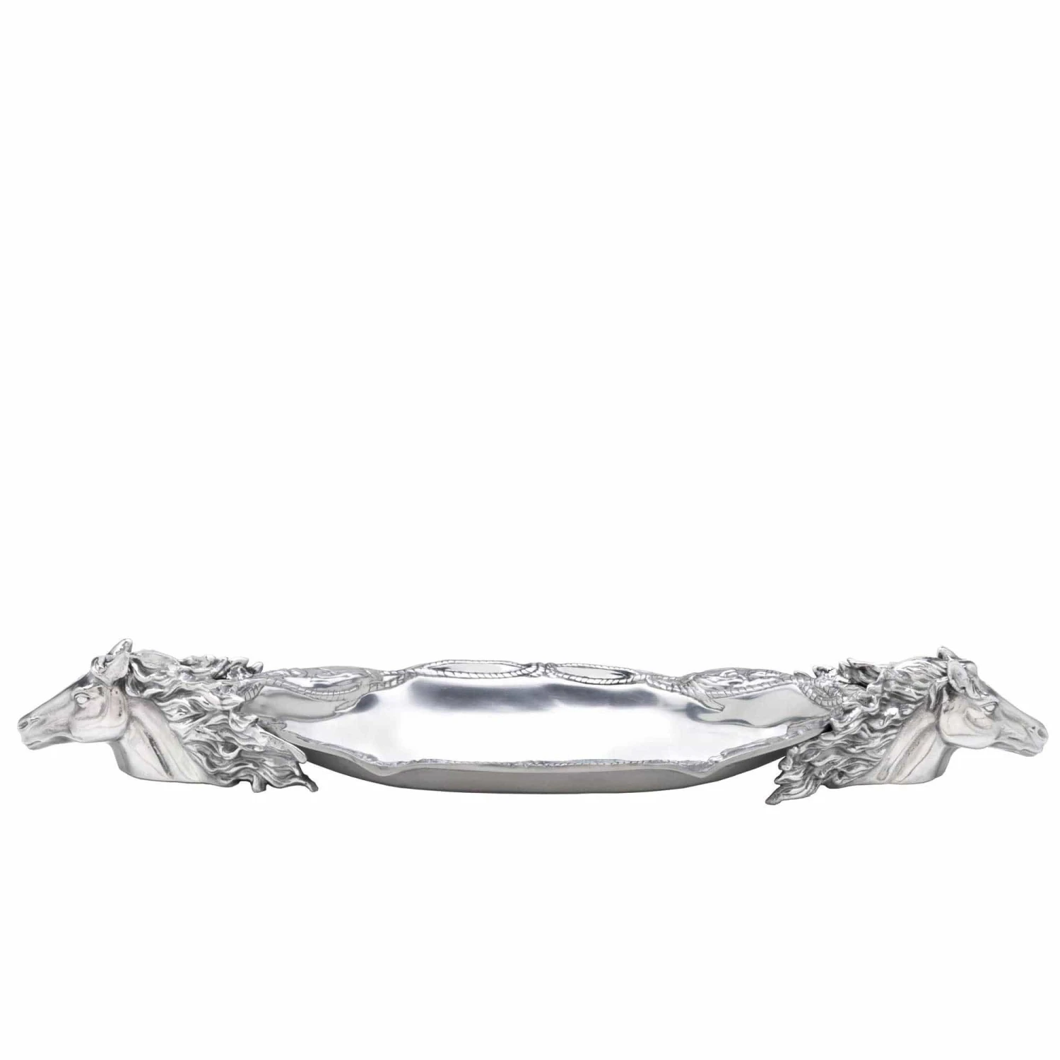 Stallions face away from each other on opposite sides of this dish as their manes exhibit a natural, free-flowing spirit. Ropes twist in beautiful harmony as they circle this handmade, aluminum tray to connect the horses.