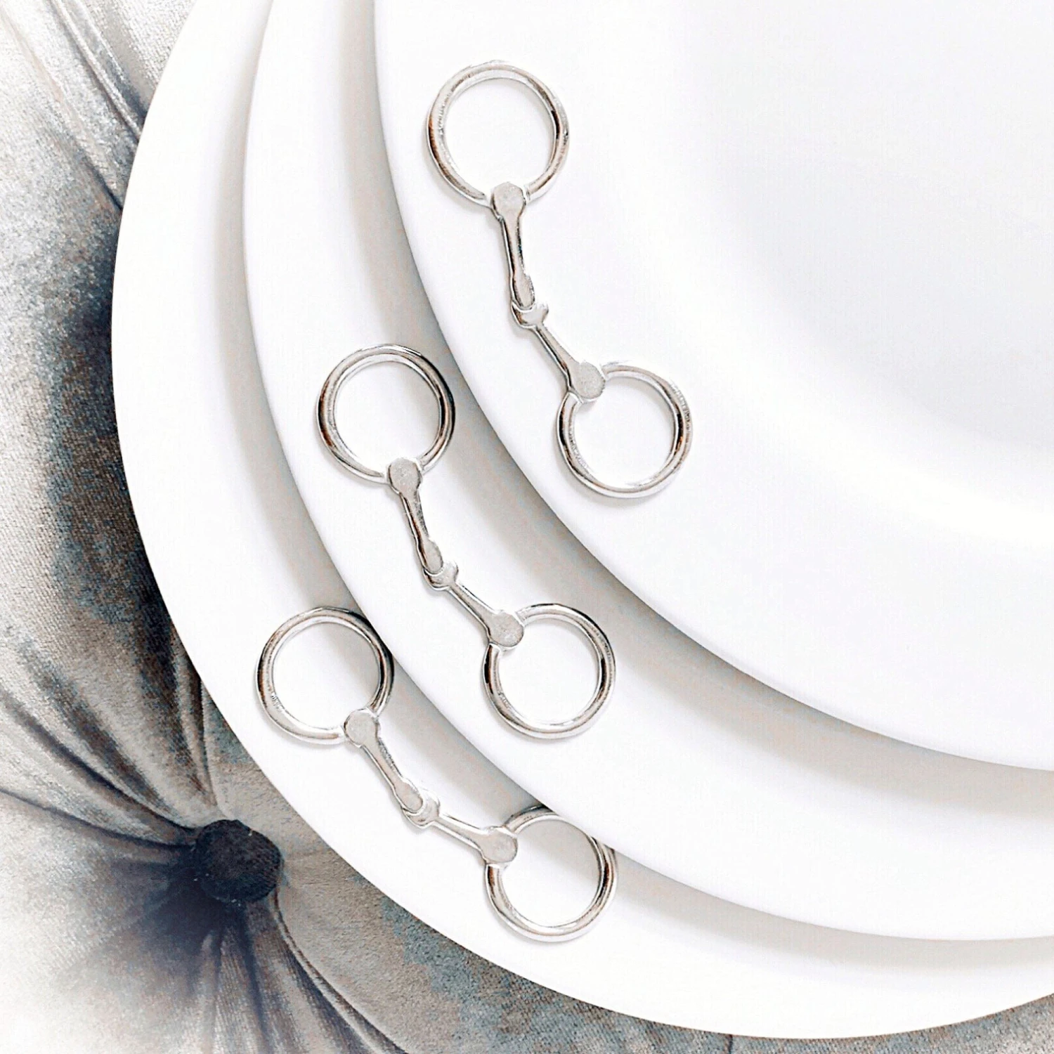 We love the gorgeous clean, classic look of these elegant lunch plates with an equestrian surprise- a lovely pewter bit on each plate.