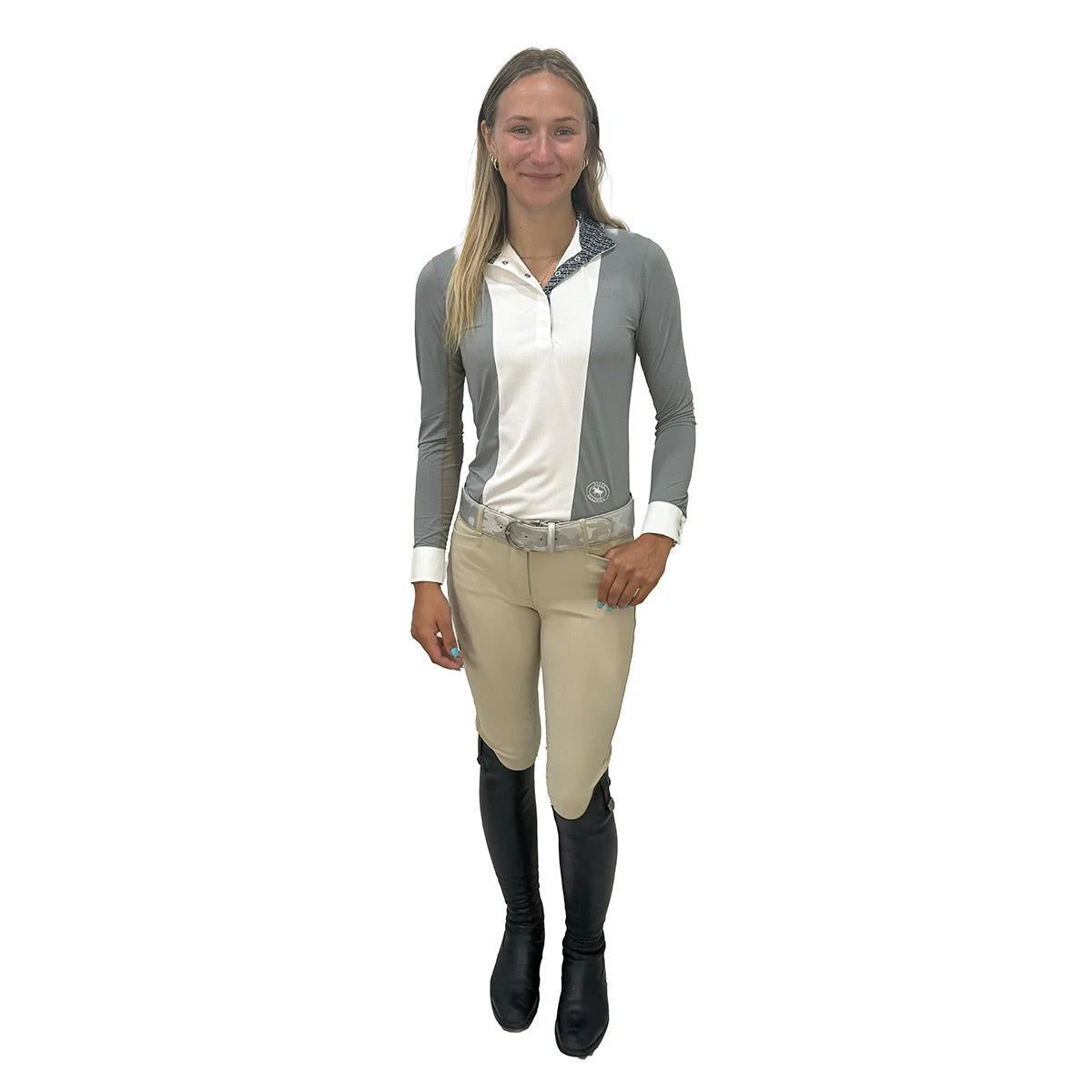 We are obsessed with the new hunter-look show shirt from Essex Classics. The Luna pairs the talent yarn fabric with figure flattering color block design on the sleeves and sides of the shirt while maintaining a classic white front under your show coat.