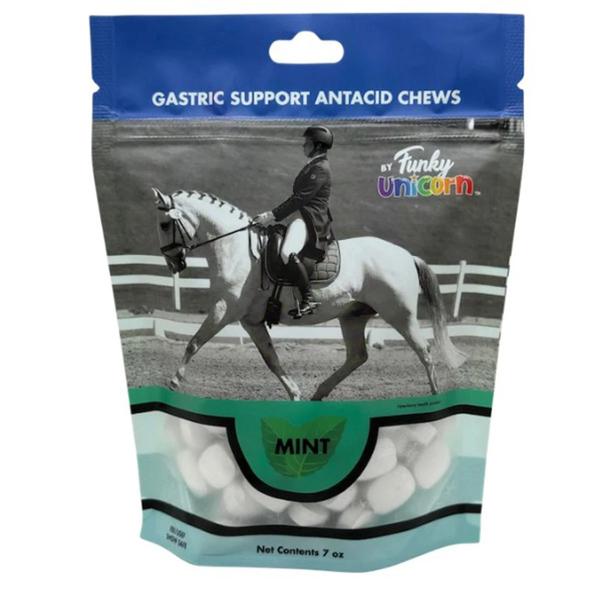 Gastric Support Antacid Chews By Funky Unicorn are intended to help minimize gastric irritation at the immediate time of stress by helping to reduce gastric pH levels. The recommended amount of chews and frequency will vary by the weight of your horse.