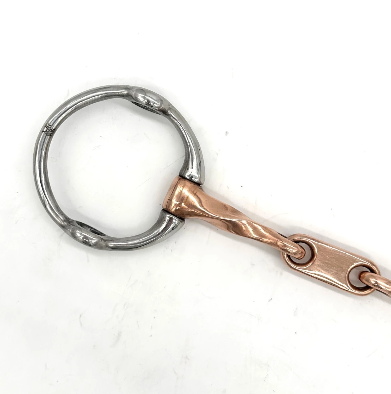 The Twisted Copper Fixed Gag with Dr. Bristol Link Bit combines a twisted copper mouthpiece for increased responsiveness with a Dr. Bristol link for even pressure distribution. The gag design offers a gentle lift, making this bit ideal for horses needing improved head carriage and refined balance.