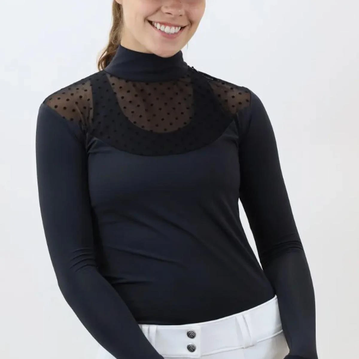 We adore the eye-catching design of this creative new Kismet Kiley Mesh Panel Show Shirt. It’s a little different from the normal fare. The “Kiley” is a gorgeous mesh panel shirt with a deep V mesh back creating an eye catching, flattering design. The polka dot pattern is subtle as well as adding an elegant flare that is sure to make you stand out from the competition. the strategically placed thumbs holes ensure your comfort as well as keeping your sleeves in place under any regular or show jacket