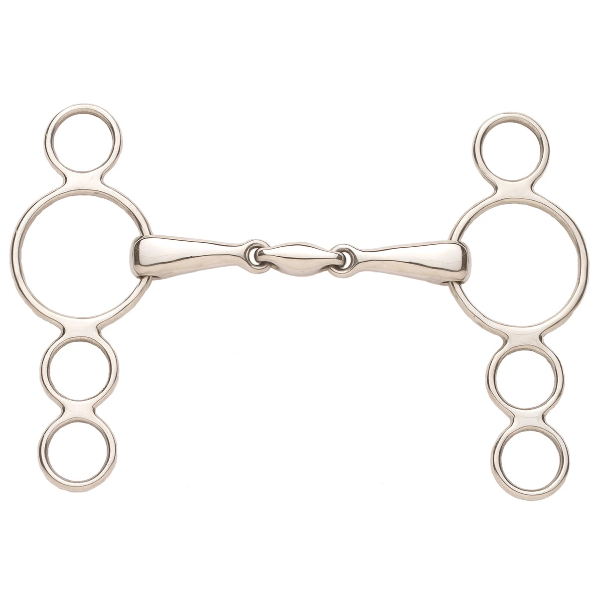 The Ovation Elite Bits feature a shorter rotated link, which allows it to rest entirely on the tongue when rein pressure is applied. This special positioning allows for more precise communication through the reins. This bit is for experienced hands as the gag incorporates leverage with the standard snaffle action and adds pressure on the poll. This bit is used to elevate the horse’s head.