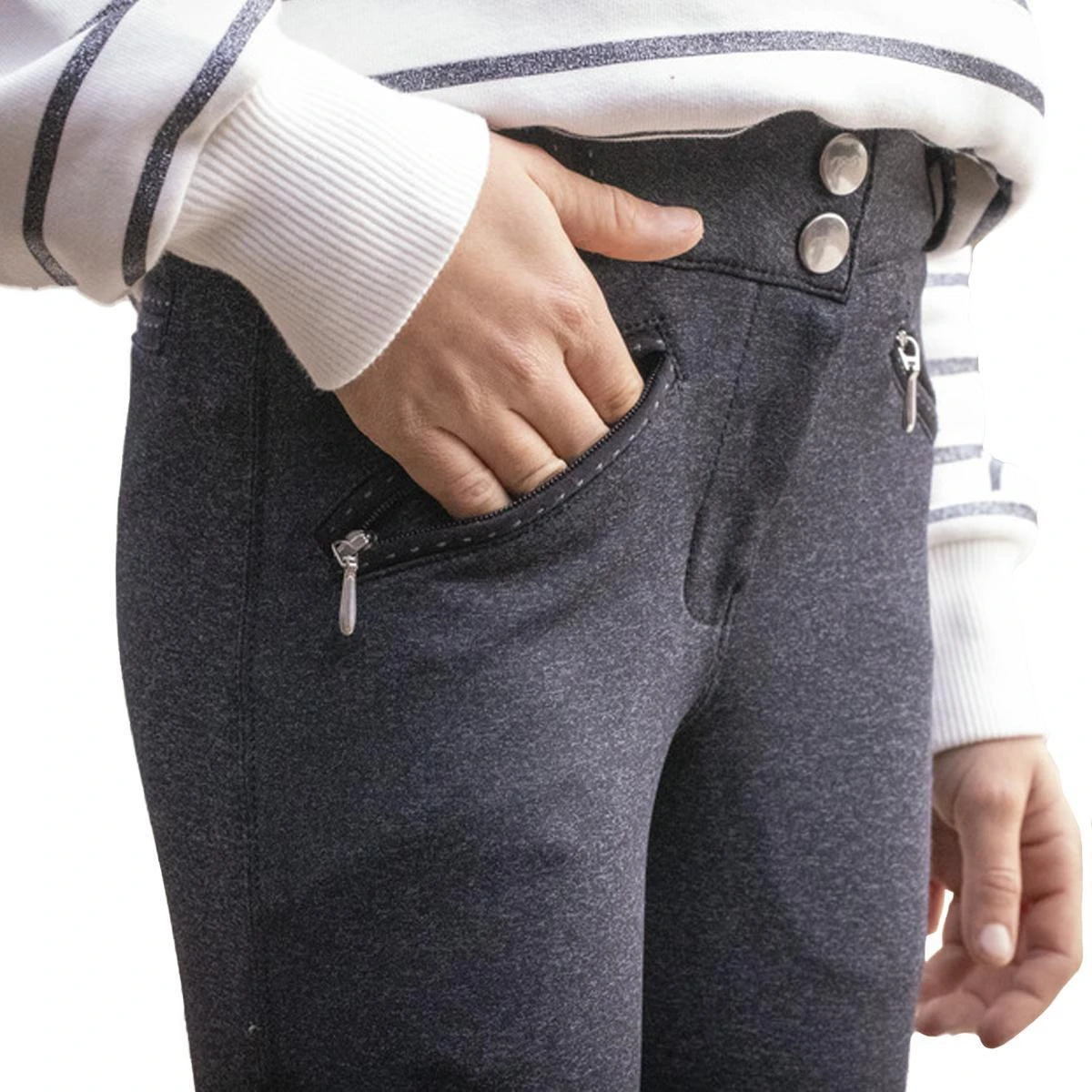 Part of the Eden by Pénélope Collection. The heather gray Romy breeches for children are extremely comfortable thanks to their particularly stretchy, close-fitting fabric. They feature two front zipped pockets and a slightly wide, snug-fitting waistband. Its Lycra lower legs adapt to a wide range of body shapes. Its original heather gray color will cause a sensation at the stables.