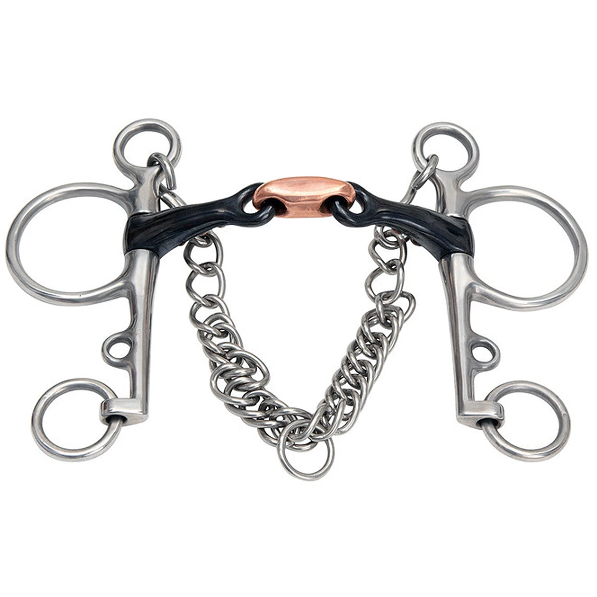 With a sweet iron mouthpiece designed to produce a sweet taste and encourage salivation as it oxidizes. The addition of copper ribs help to prevent the horse from taking to much contact, a good deterent for horses that tend to take hold. Pelham’s work on the poll, corners, bars, tongue and chin groove. This is a stronger bit that will assist with control. The jointed mouthpiece works to prevent any nutcracker action.