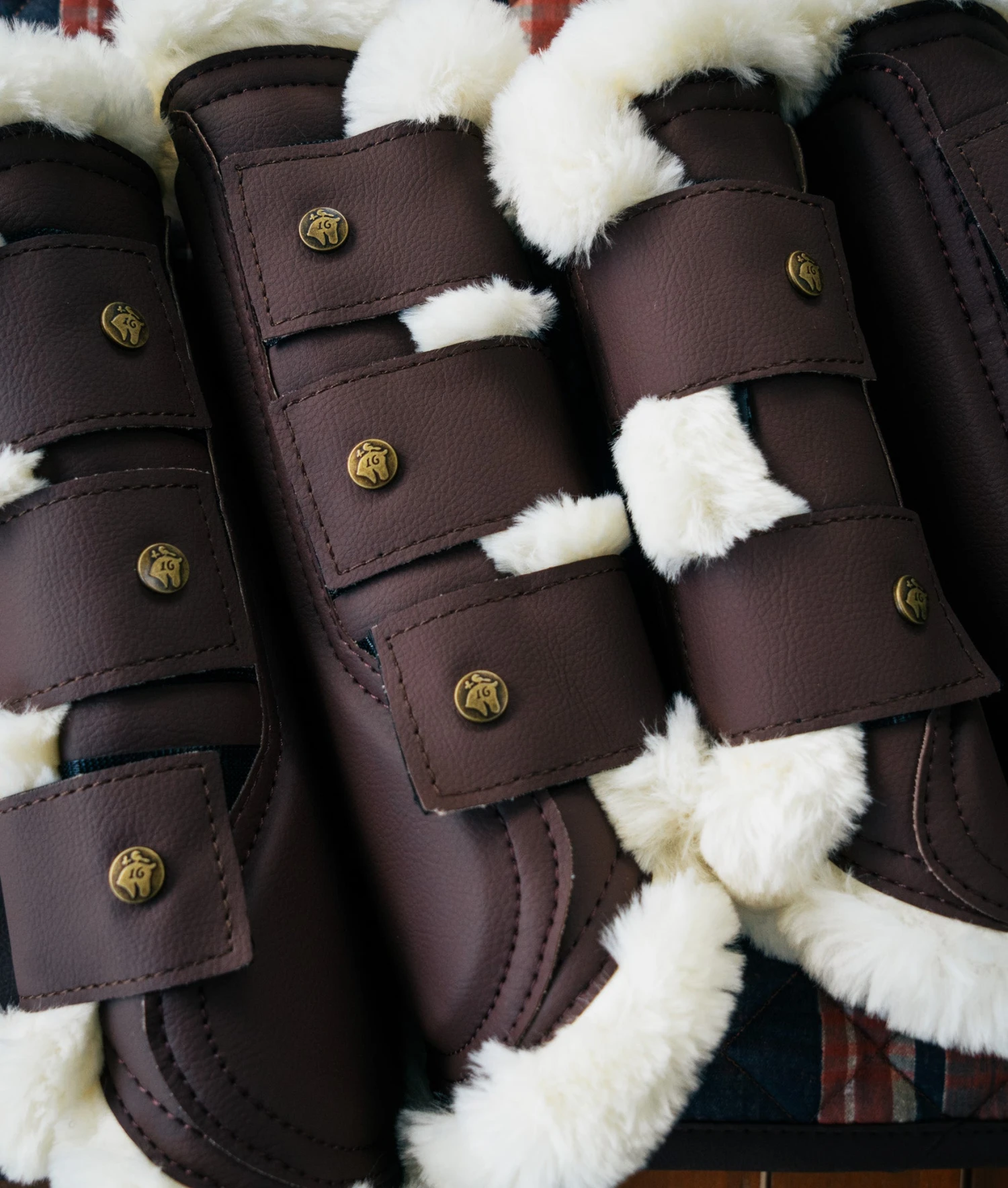 16 Brushing boots in hickory brown leatherette with ivory faux sheepskin lining.
