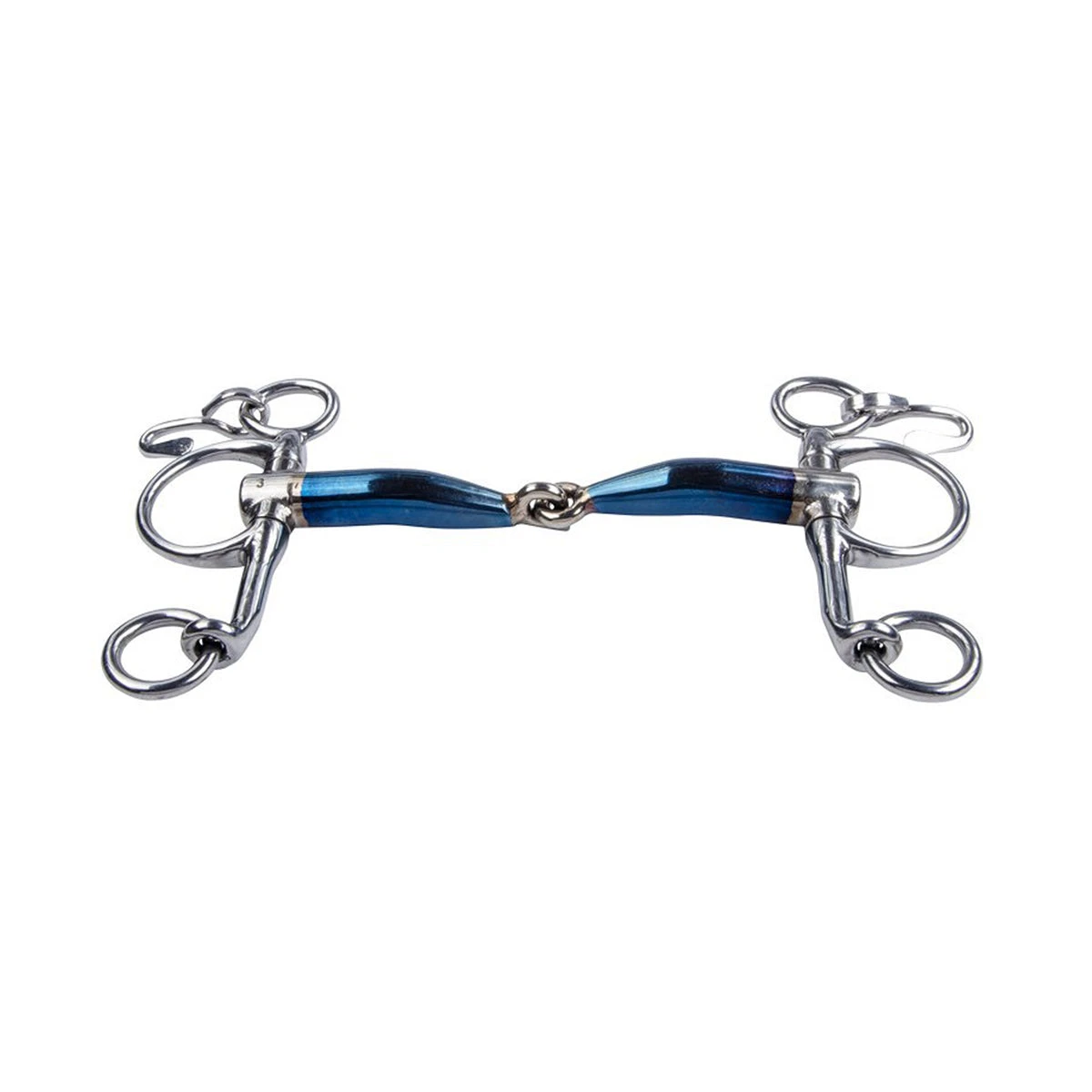 The Trust Sweet Iron Jointed Baby Pelham Bit is constructed with durable steel and features a distinct blue hue. When exposed to moisture, the sweet iron material forms a rust film that adds a pleasant taste. This encourages the production of saliva, promoting increased acceptance of the bit.