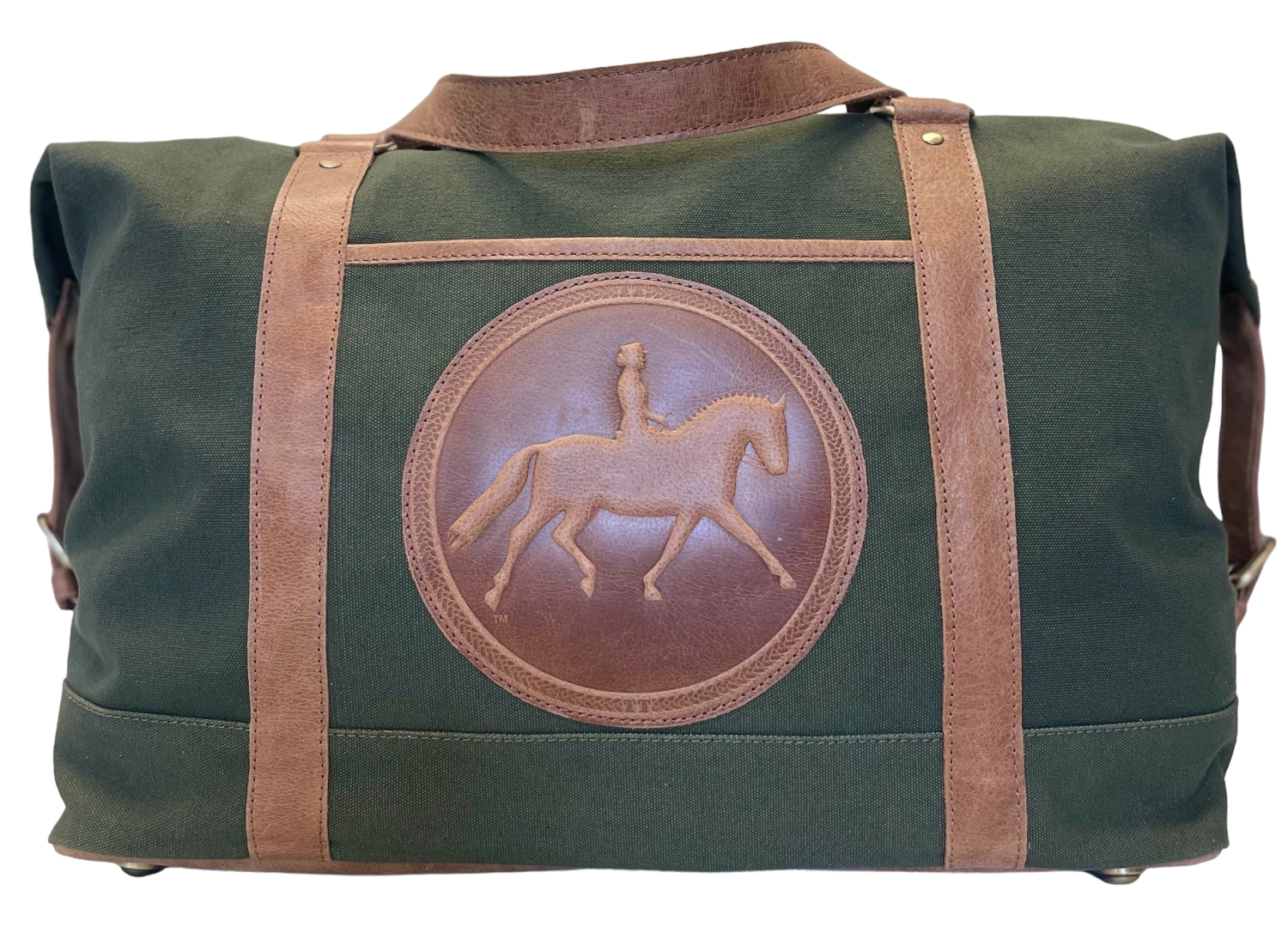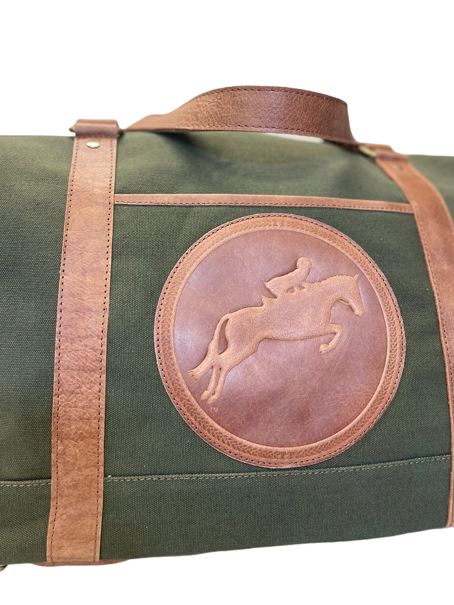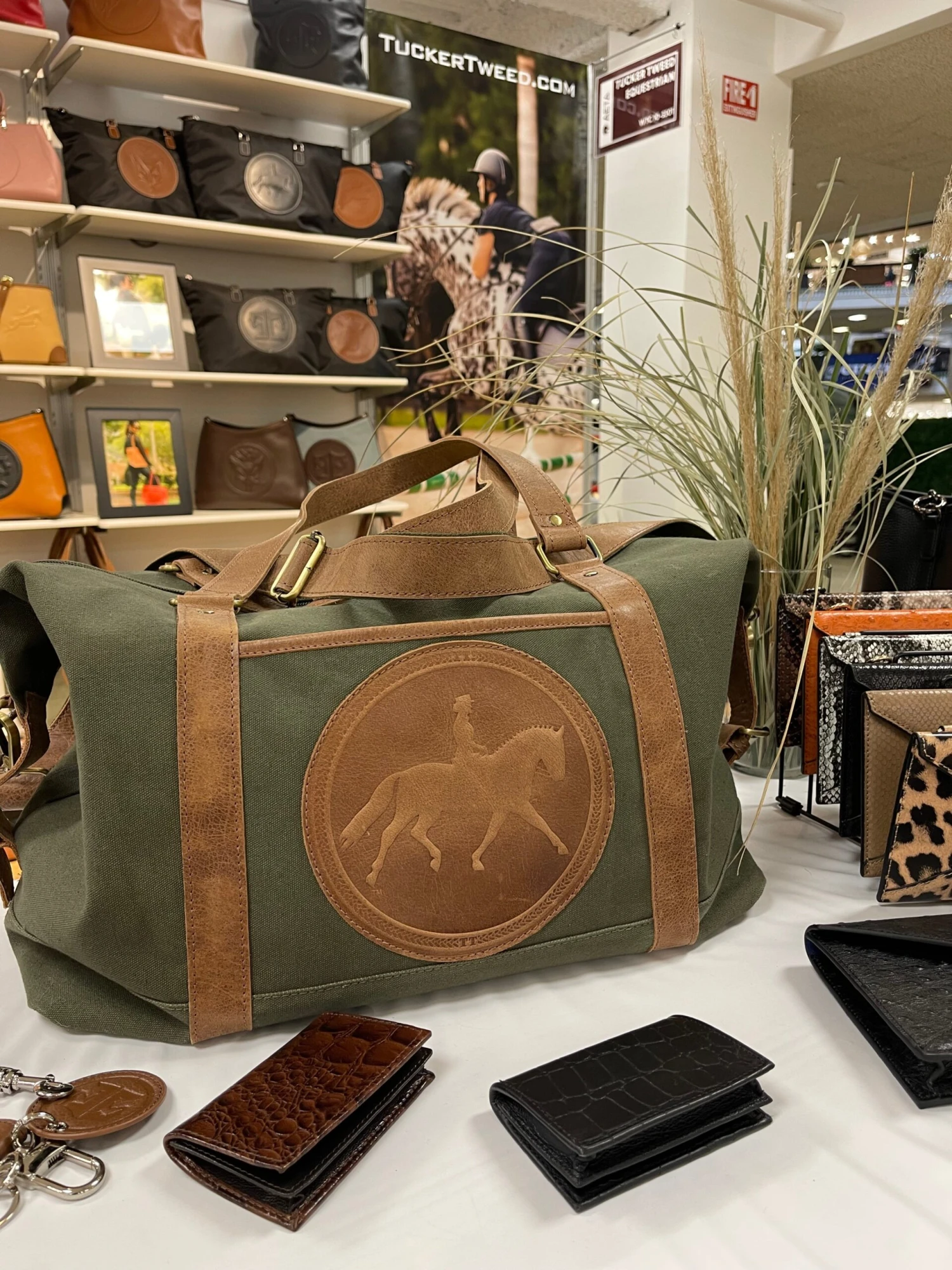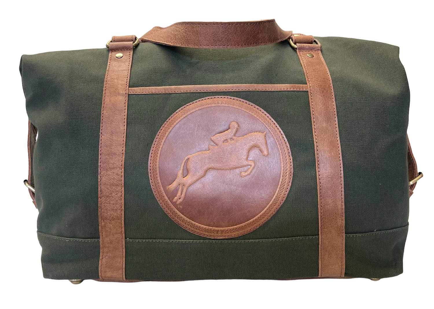 Introducing the Tucker Tweed Equestrian Barn Duffle, made with garment-dyed heavy duty canvas, featuring two-tone, eco-friendly remnant leather accents. Responsibly and resourcefully made by hand, this is the perfect duffle to complement the barn bag. Generous in size, this overnight option is ideal for show season or a weekend away. Durable and practical with reinforced stitching, this duffle features an interior zip pocket, adjustable and removable shoulder strap and an exterior pocket located on our “trolley” sleeve to attach easily to rolling luggage.
