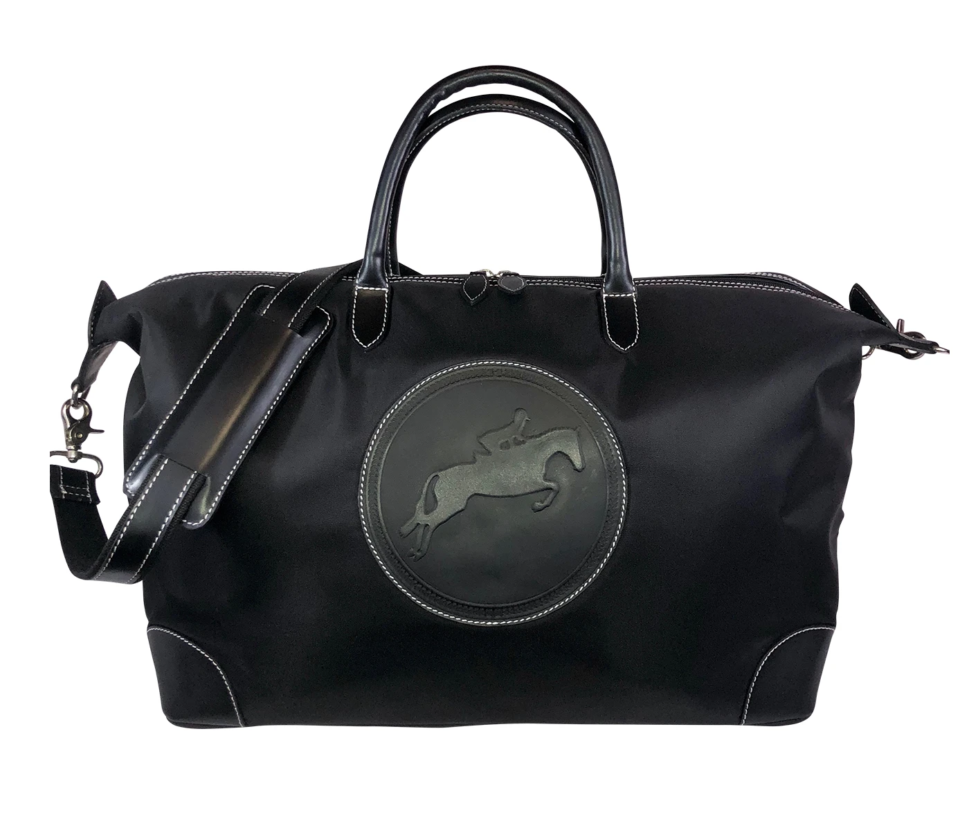 Our goal from the launch of the Tucker Tweed Equestrian brand 6 years ago was to ultimately travel in Equestrian style. We could not be happier to debut the newest piece of our collection. This generous overnight duffle bag is designed with padded heavy/duty 900d black nylon featuring full grain smooth leather accents in tones of chestnut or black. Comfort continues with supple rolled leather handles and an optional, adjustable padded shoulder strap. Refined interior with private zip and open pocket. Finished with silver feet and hardware.