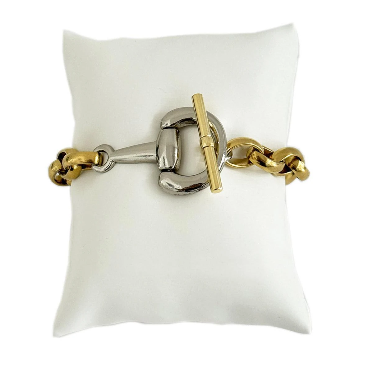 Silver, gold, and an eggbutt snaffle to hold, we absolutely love the combination created by V2 Designs. The gold link bracelet with silver eggbutt snaffle and gold toggle clasp are a must-have for your collection. The open link chain is 14 kt. gold plated, built to last with a silver plated half snaffle which serves as the toggle closure.