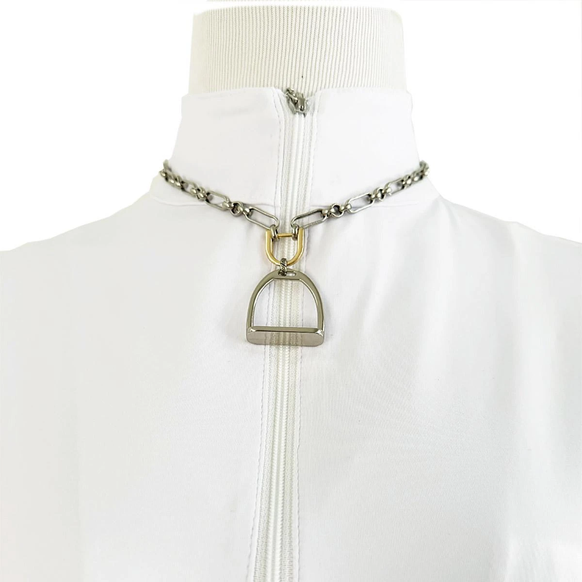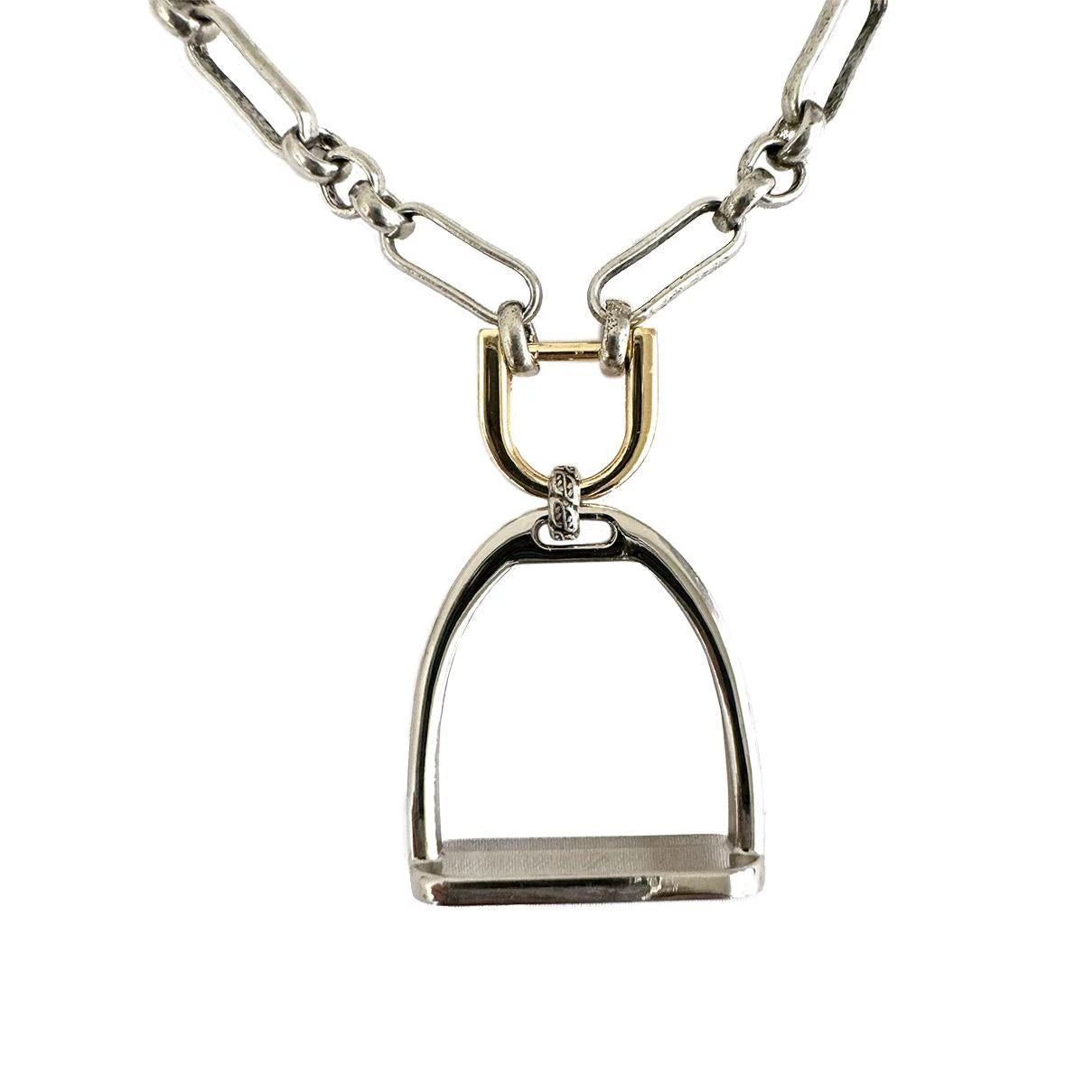 The V2 Designs Loose Link Mixed Media Stirrup Necklace is the perfect combination to make a statement! This elegant design showcases a silver plated link necklace with a sterling silver plated mini stirrup. The stirrup is attached by a gold-toned embellishment and the necklace is held together by a lobster clasp.